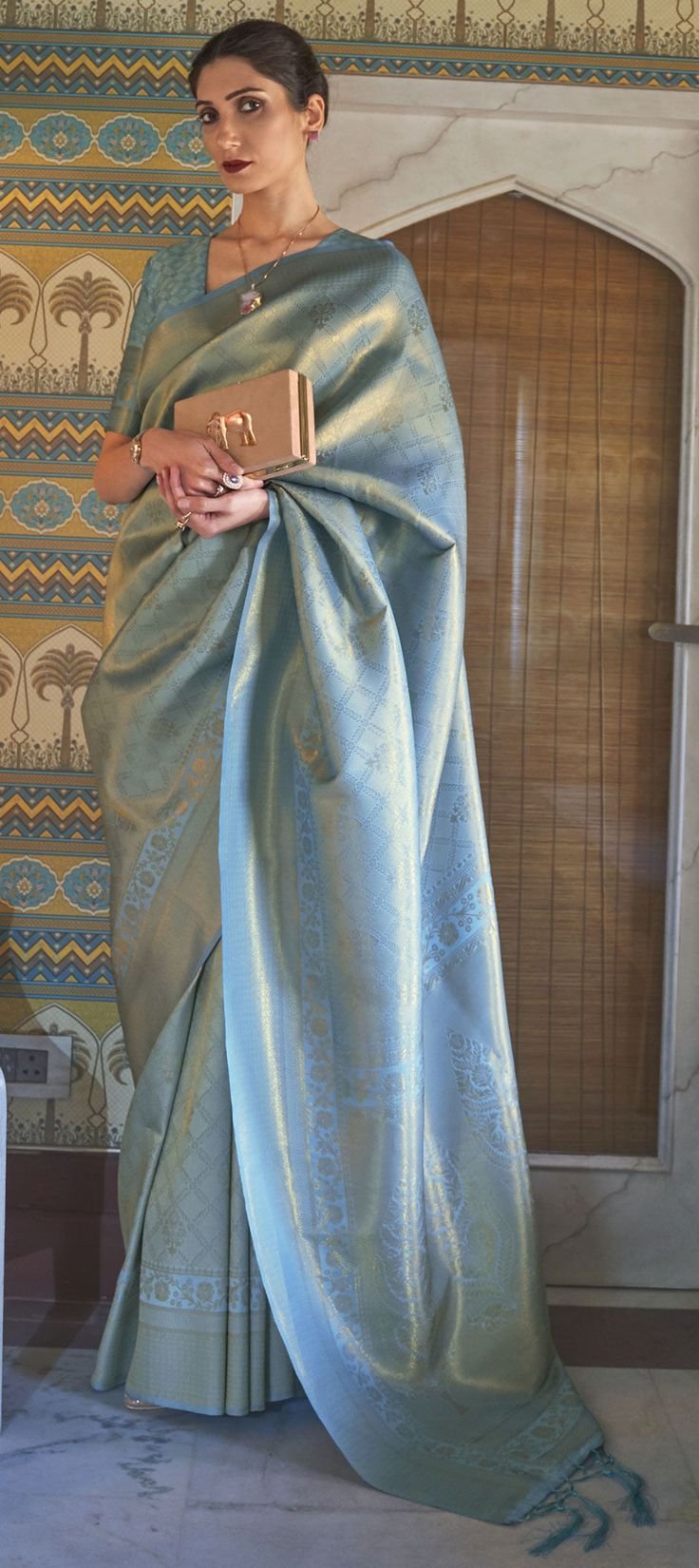 The accompanying running printed Dola Silk blouse completes the coordinated ethnic look.