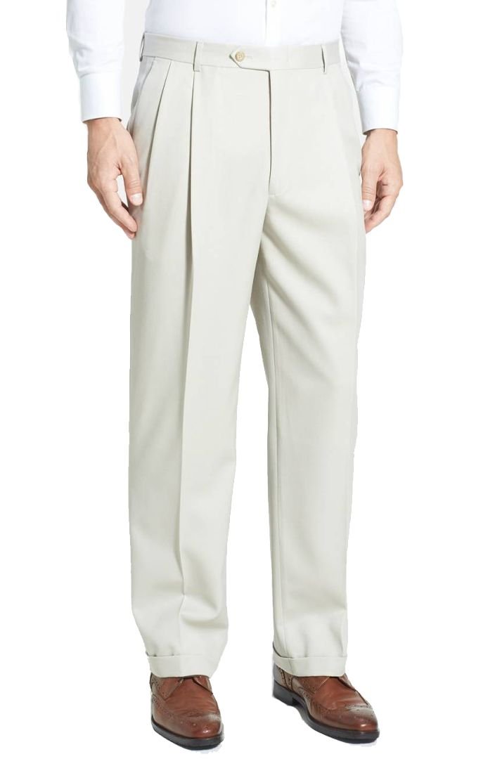 High-quality Super 100’s Gabardine pleated trousers for men.